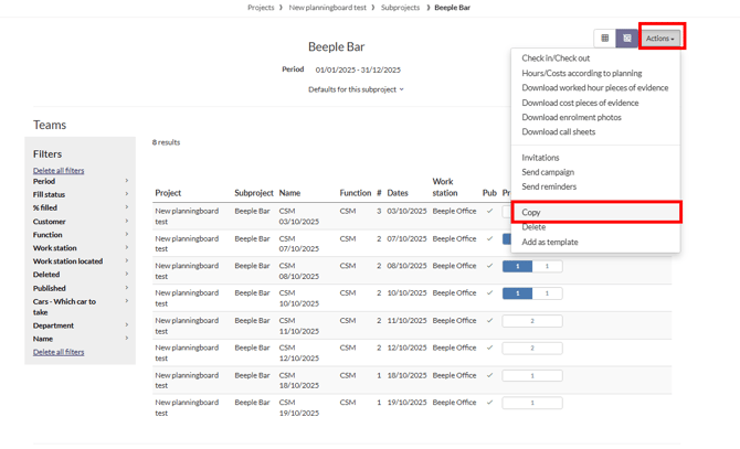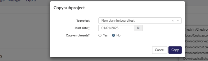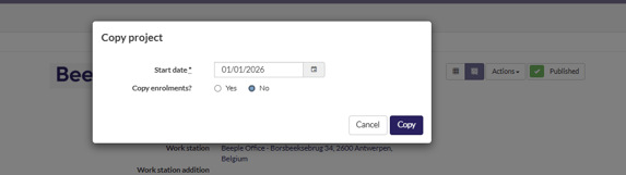 Then, choose the project where you want to duplicate this subproject. Specify the desired start date for the copied subproject. Finally, indicate whether you wish to include all existing enrolments in the copy.
