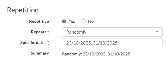 • Every: Define the frequency of repetition (e.g., every 1 week, every 5 weeks, every 1 month, every 10 months).