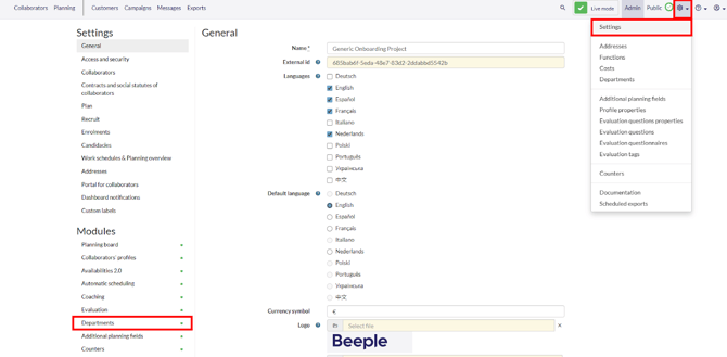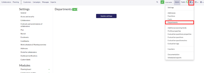 To create departments go back to the gearwheel and select “Departments”