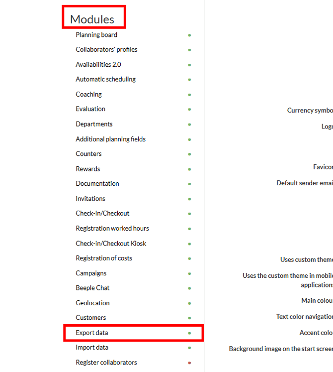 From the "Modules" list on the left, choose "Export data."