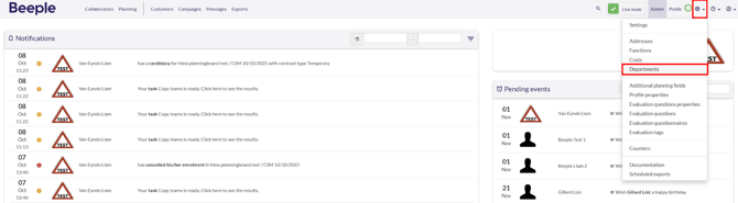 This page displays a list of existing departments. You can also create new departments by clicking the "+" icon on the right.