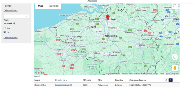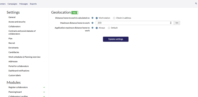 When the module 'Geolocation' is activated, you can set a maximum distance home to work, which functions as additional filter when creating the planning. This module also enables you to display addresses in Google Maps.