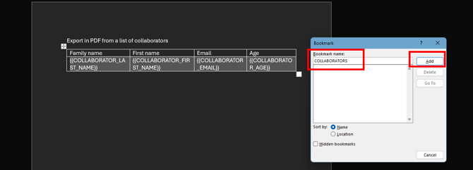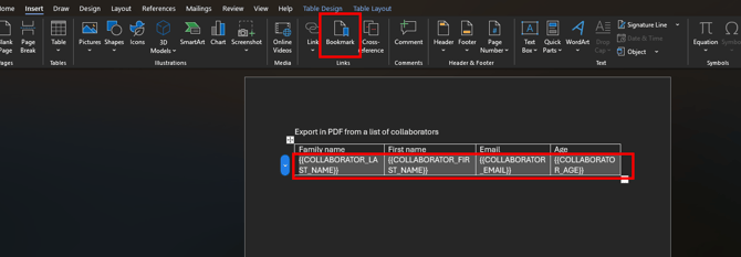 PDF export templates combine text and dictionary codes. Remember, codes within a table will only be replaced if a bookmark is added to the table in Word. Follow these steps: