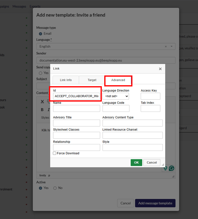 • Enter ACCEPT\_COLLABORATOR\_INVITATION\_LINK in the 'Id' field.