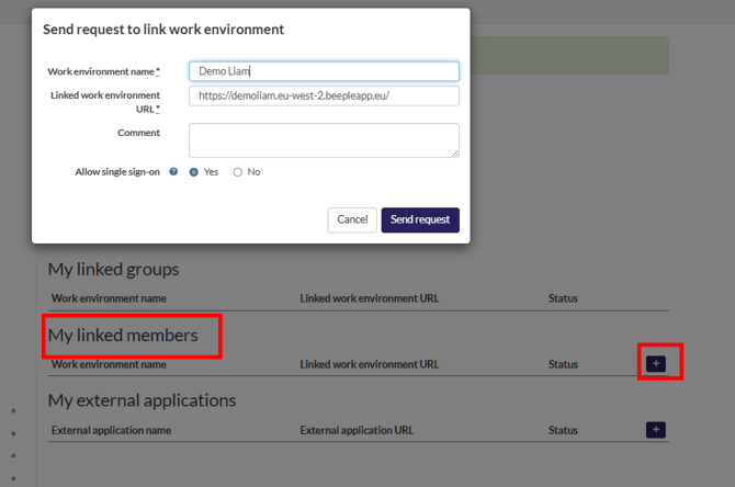 From your primary environment (the one you wish to be the main environment for the group), select the '+' icon located in 'My linked members'.