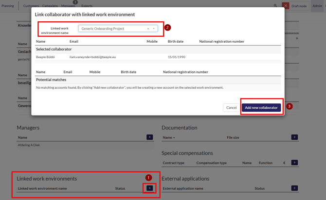 If no potential matches are found, you will have the option to automatically create the collaborator in the linked environment. This action will create a new account for the collaborator, including all their personal data. This option is only available if the email address has not yet been used in the other tenant; otherwise, it would appear as a potential match.