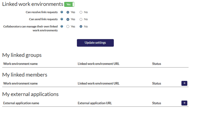 An administrator must configure the necessary settings. Navigate to any collaborator's profile page and locate the "Linked work environments" option.