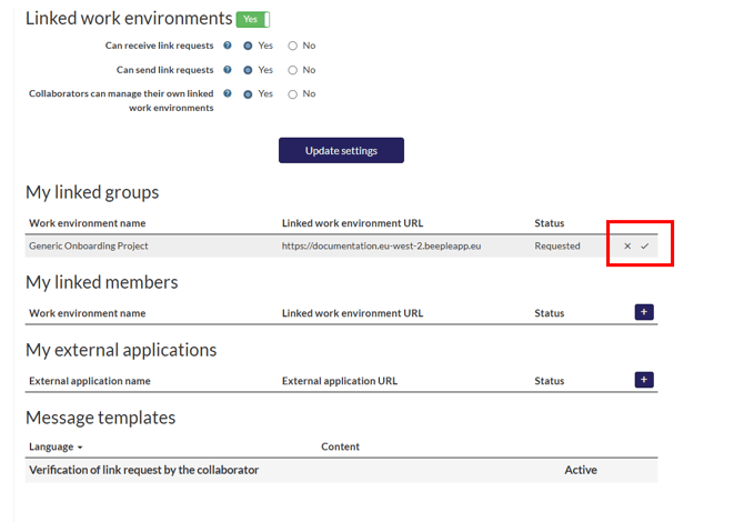 After selecting 'Accept link,' a connection will be established between the two environments, and the 'Accept link' screen will appear, allowing you to configure SSO settings. Additionally, a message will be displayed on your dashboard if you possess the necessary access rights to 'Linked work environments.'