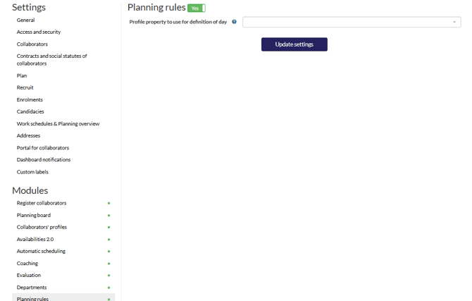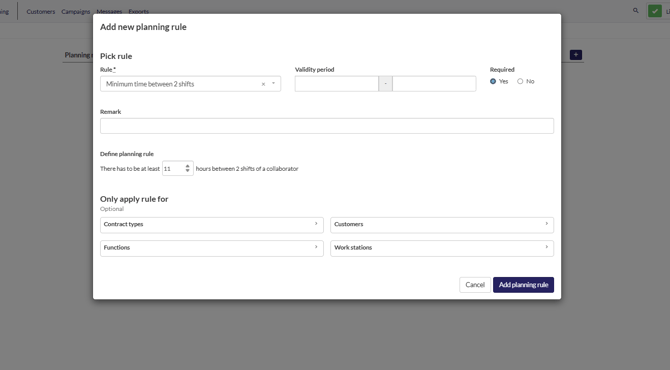 With the 'Planning rules' module activated, you can establish planning rules, such as a mandatory 11-hour rest period between shifts or a maximum of 38 planned hours per week. Each planning rule can be associated with a specific contract type and planning period.